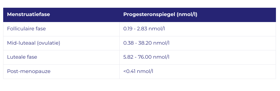 Progesteronspiegels worden gemeten in nanomol per liter (nmol/l). De onderstaande grafiek geeft een overzicht van normale niveaus van progesteron voor een volwassen vrouw tijdens verschillende momenten in de menstruatiecyclus.
